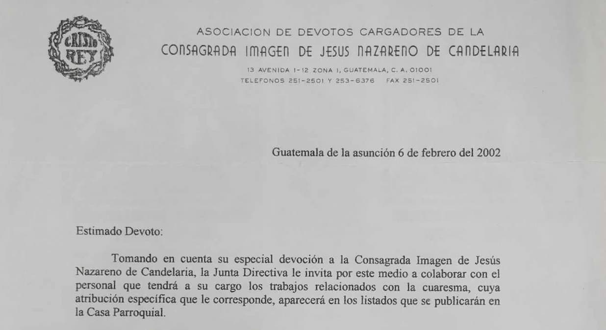 La Carta era para convocatoria que se nos hacía a los miembros de la hermandad de Candelaria para colaborar en la santa cuaresma, firmada por nuestro querido Monseñor Marco Aurelio González Iriarte y el encargado general de ese entonces. Íbamos a buscar nuestro nombre y saber dónde nos correspondería trabajar.