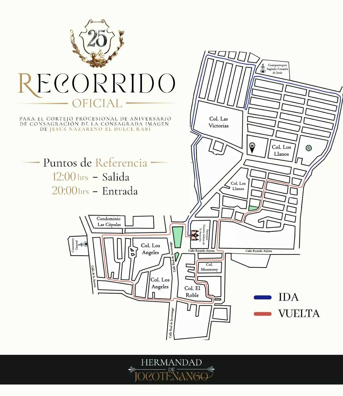 El trayecto contempla claramente los tramos de ida y vuelta, recorriendo colonias como Las Victorias, Los Llanos, Los Ángeles, Monterrey y El Roble, así como calles principales del sector, convirtiendo cada espacio en un lugar de oración y encuentro con Dios.