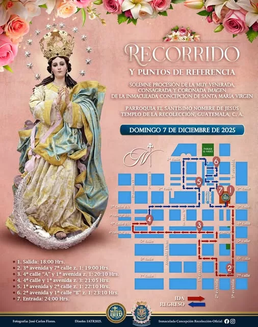 El Reverendo Padre Julio Alejandro Barrios Azurdia, Párroco de la Parroquia Santísimo Nombre De Jesús, Templo De La Recolección, anuncia con alegría y regocijo en el Señor, el Recorrido Oficial de la Solemne, Histórica y Triunfal Procesión Conmemorativa, de la Consagración y Coronación Canónica de la Venerada Imagen de la Inmaculada Concepción de Santa María Virgen, que Dios mediante saldrá el próximo sábado 7 de diciembre de 2025.