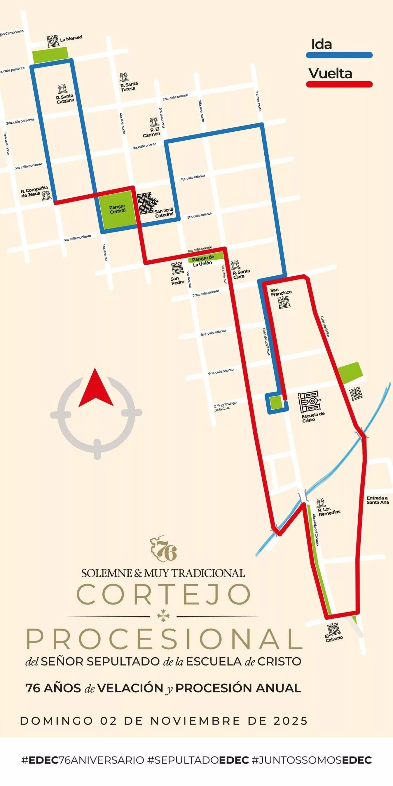 Como parte del programa de actividades por el 76° aniversario de velación de la consagrada Imagen del Señor Sepultado de la Escuela de Cristo en honor a los fieles difuntos, se realizará la tradicional y muy solemne procesión que recorrerá las calles principales de la Antigua Guatemala. Este año se han realizado variantes en el recorrido.