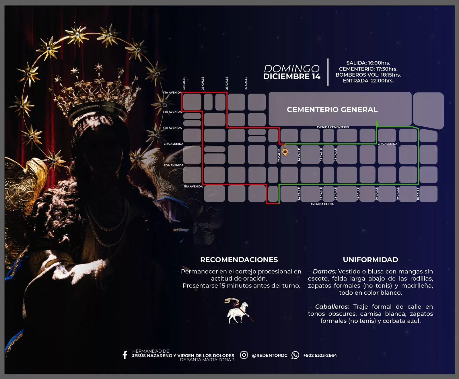 El recorrido abarca avenidas y calles tradicionales del barrio, incluyendo 18a avenida, 2a avenida, 3a avenida, 5a avenida, avenida cementerio y sectores donde la comunidad de Santa Marta se reúne año con año para honrar a la Madre Inmaculada.