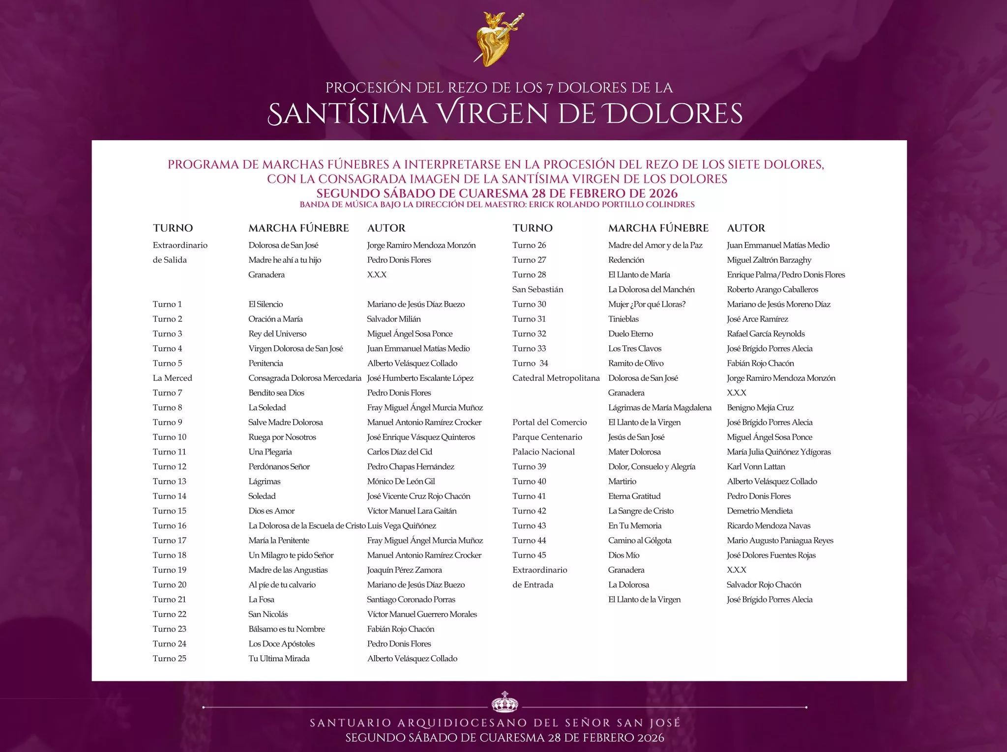 Durante la procesión se interpretará un amplio repertorio de marchas fúnebres dedicadas a la Virgen de Dolores, incluyendo composiciones como: