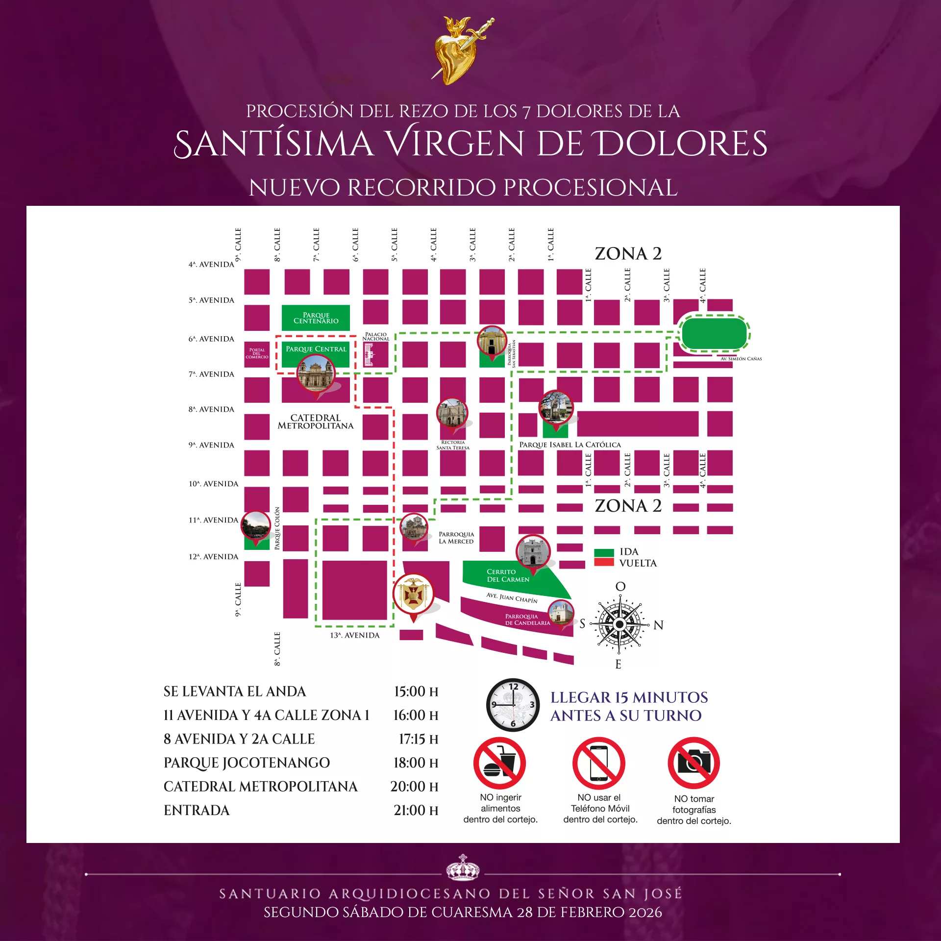 El recorrido de la Virgen de Dolores de San José ya fue anunciado oficialmente para el Segundo Sábado de Cuaresma, 28 de febrero de 2026, en el marco de la tradicional Procesión del Rezo de los 7 Dolores de la Santísima Virgen de Dolores.
