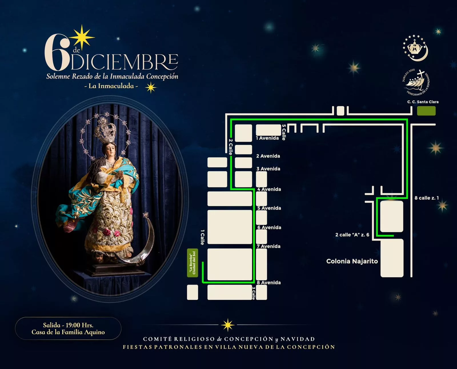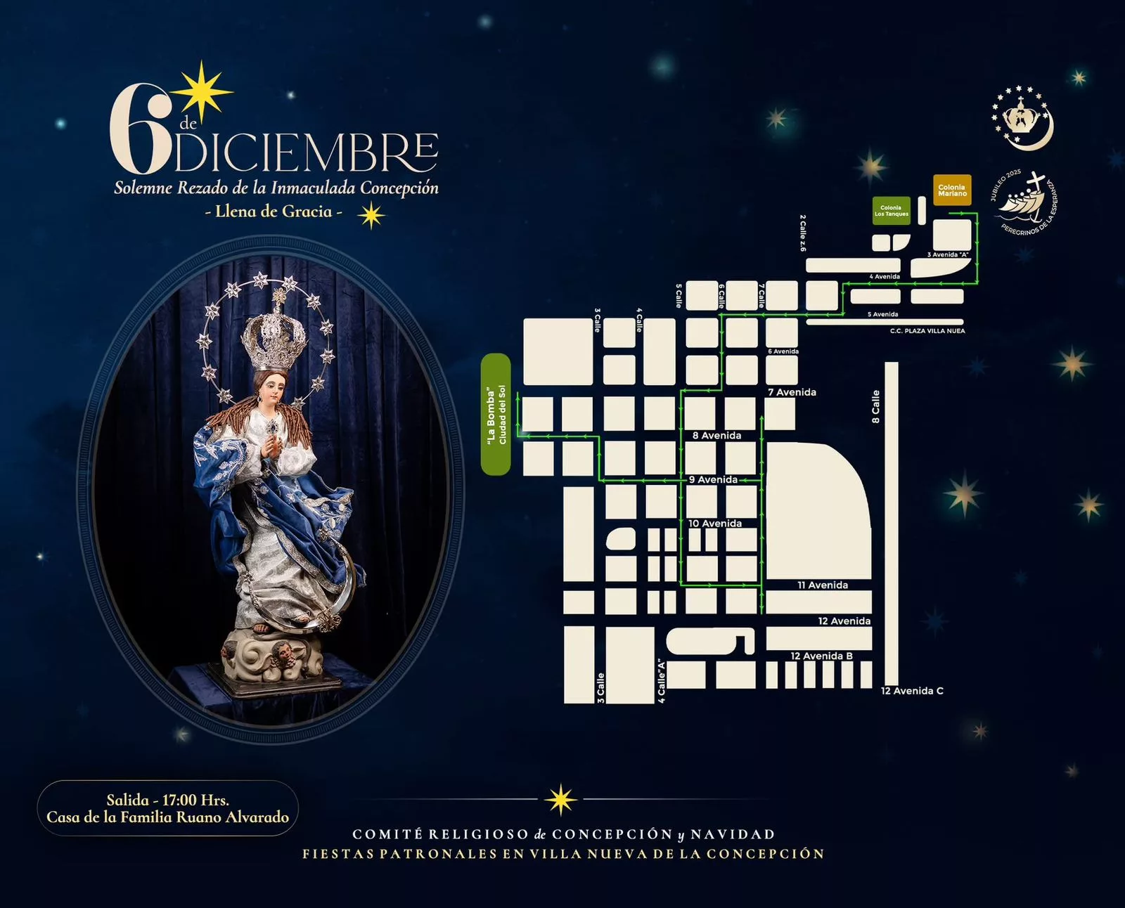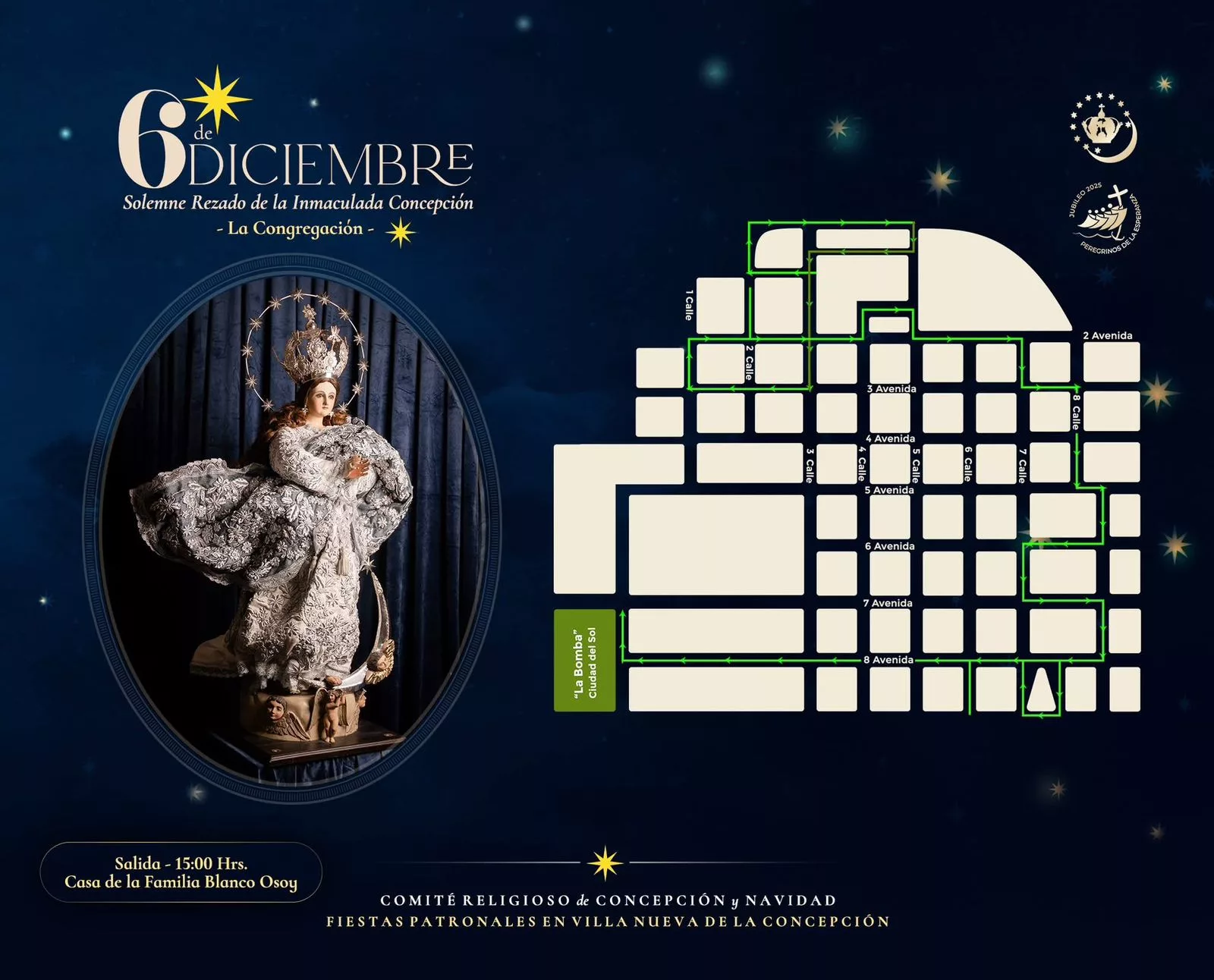 El 8 de diciembre se vive con profunda devoción y júbilo. La jornada incluye la Santa Misa Mayor, adoración a Jesús Sacramentado, repique de campanas, concierto de marimba y una solemne procesión alrededor del Parque Central, acompañada por las imágenes visitantes que recorrieron hogares villanovanos durante el año.