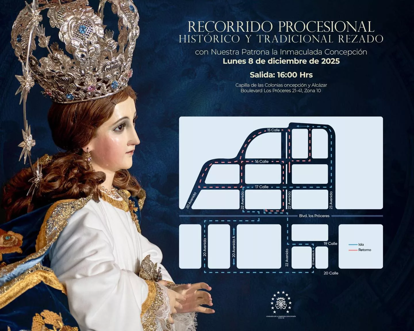 El momento culminante llega a las 16:00 horas, cuando inicia el Solemne y Tradicional Rezado, saliendo de la Capilla ubicada en las colonias Concepción y Alcázar, sobre el Bulevar Los Próceres. El recorrido, acompañado por los sones tradicionales “Pues Concebida” y “Las Tortugas”, atraviesa calles destacadas de la zona 10, incluyendo la 15 calle, 16 calle, 17 calle, 20 avenida, 22 avenida y sus alrededores, pasando por sectores emblemáticos del vecindario.